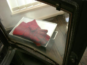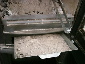 キレイになりました。炉内には灰を3~4cmの厚さに残します。昨日の燃え残りを灰の中から出して燃えやすく真ん中に集めました。回りをきれいに拭いて終了です。