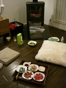 具材と飲み物、皿、BBQの金串を用意してどんど焼きスタートです。