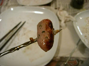 BBQの金串に一口サイズの切った具材を刺してストーブの中へー。