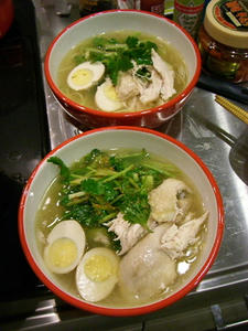 完成!トッピングにはシャンツァイとセロリの千切りをごま油で和えたもの、ゆで卵、メンマ、鶏肉。