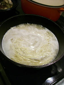 鶏ちゃんを取り出して、水で薄めて塩、酒、コショーで味を調えて麺を放り込みます。期待に胸が膨らむときです。