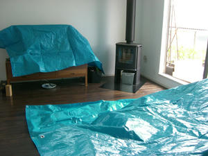 まずはブルーシートで部屋を養生。どんなに気をつけてやってもススが舞ってしまいます。去年は白いソファーに黒いススが点々となってしまって掃除が大変だったので、今年はきちんと覆います。