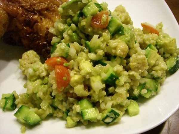 ライスサラダ。ミニトマト、きゅうり、アヴォカド、玄米、ひよこ豆。オリーブオイルとレモンでさっぱり。