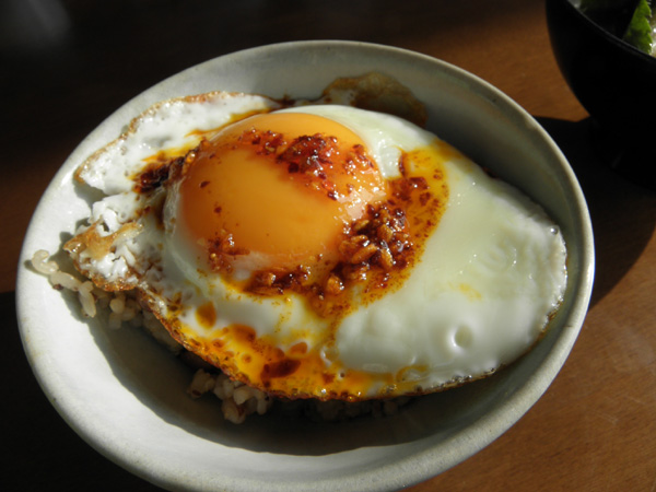 話は変わって、スーパーでたまたま話題の桃屋の「辛そうで辛くない少し辛いラー油」を見つけたので買ってきました。こんな食べ方もできます。旨そうでしょ?