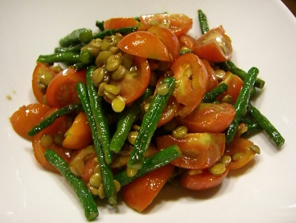 材料:トマト、インゲン、ニンニク、レンズマメ、塩、オリーブオイル、バルサミコビネガー(お好きな酸っぱいもので)