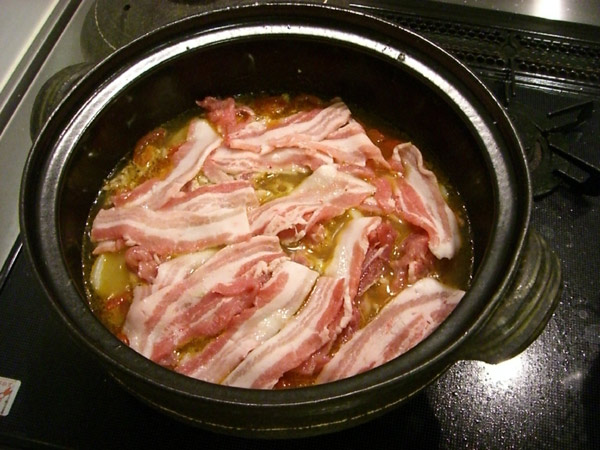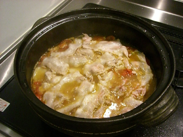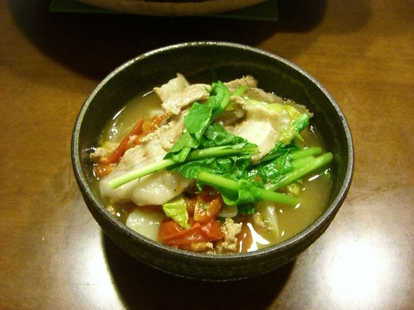 トマトの酸味とショウガ、ブタの三枚肉の甘みが渾然となって美味しいです。あえて和風の味付けにしたのがミソです。