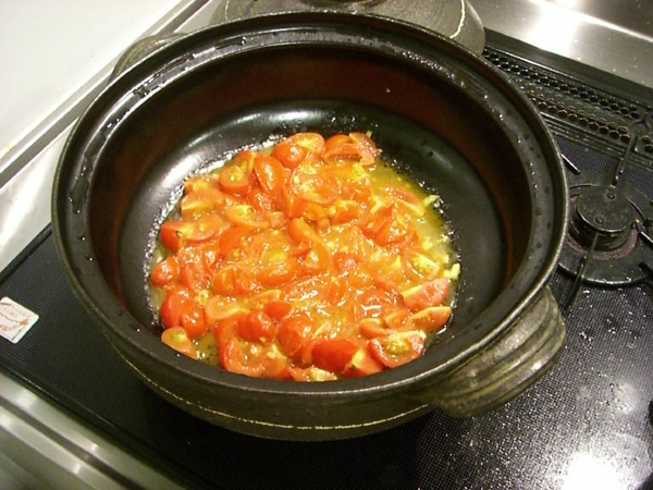 トマトがこんな感じになったらOKです。パスタのトマトソースの要領ですね。
