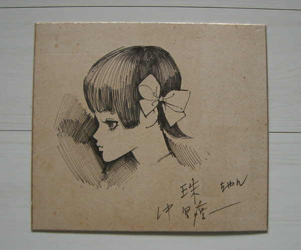 話は変わりますが、TAMAさんの実家の引越しでこんな絵が出てきました。TAMAさんが幼稚園くらいのときに、銀座のデパートで中原淳一に描いてもらった色紙だそうです。40数年前はこんなに可愛かったんですね~