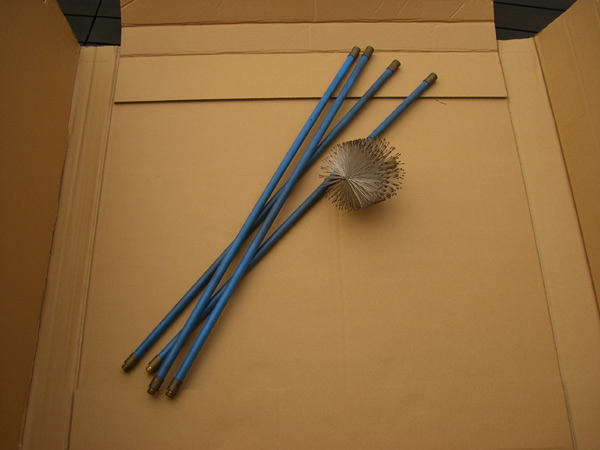 煙突の内径に合わせたこんな特別なブラシを使います。青い棒はそれぞれネジでつながるようになっていて、煙突のてっぺんまで届く長さです。
