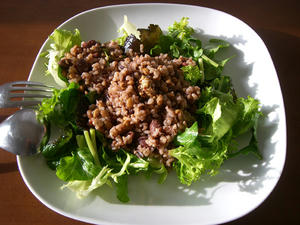 オリーブオイルでトスした葉っぱの上に、ご飯にオリーブオイルをかけたものに納豆をまぜ、挽いたクミンをパラリ。仕上げにディジョンマスタードをちょびっと乗せて出来上がり(笑)ライスサラダです。