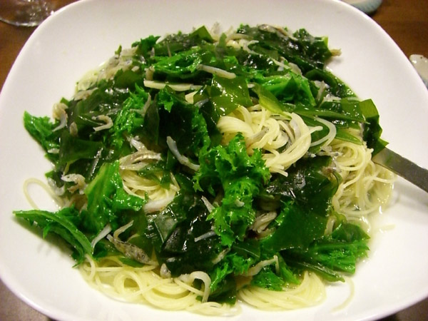 こちらは波乗りついでの海からの収穫の物ワカメパスタ。ワカメは今がシーズンなのですが、今年は水温が高かったせいか生育がいまいち。毎年楽しみにしているワカなのでちょっと残念。でも取り立てワカメは旨かったです。ちなみにチリメンジャコとわさび菜とワカメでペペロンチーノの味付けです。