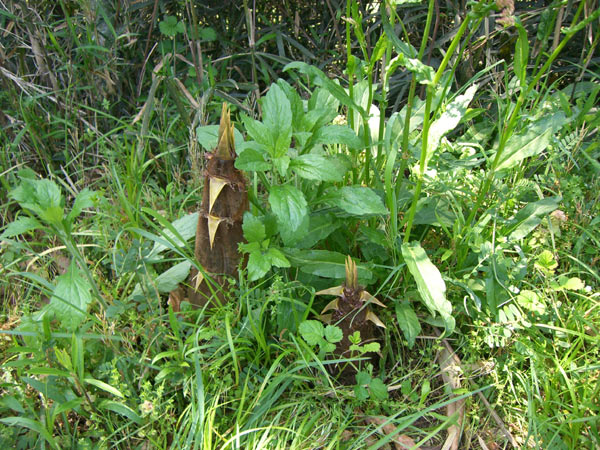 たけのこ。あちこちにたくさん顔をのぞかせています。竹林の持ち主が掘っているところに運良く出くわせば「持っていきなさい」と気軽に分けてもらえます。
