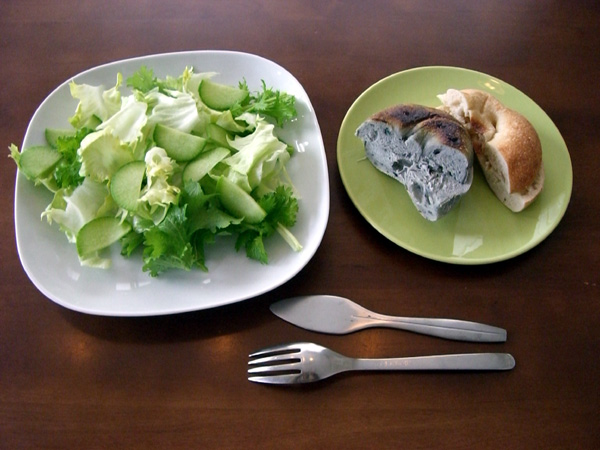ベーグルも買ってきてくれたので早速朝ごはん。オニオンとブルーベリーでした。クリームチーズを塗って、おいしいです。