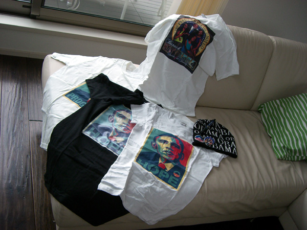 オバマ大統領グッズ。コピー商品で悪名高い、キャナルストリートで値切りに値切って買ったという、バッタもん(笑)のTシャツ。15ドルが7ドルになったそうです。ニットキャップはお友達からもらったオフィシャルグッズです。