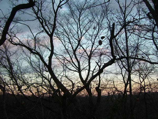 東の空は夕日を写してピンク色に染まります。木々の向こうには新宿の高層ビルが見えています。