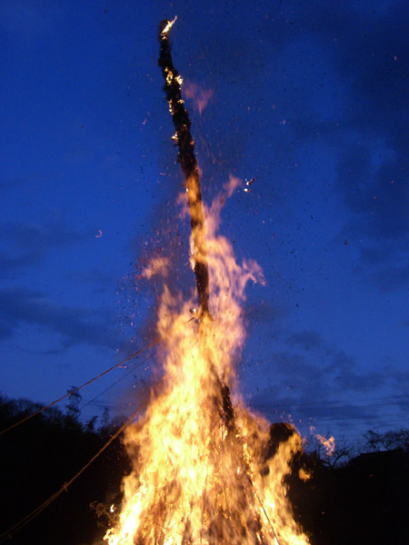 午後5時、せいの神に火が付けられました。15mの高さのせいの神はあっという間に火に包まれました。最近は火事のニュースが多いです。空気が乾燥しているので薪ストーブの薪にも本当にあっと言う間に火が回ります。火の元にはくれぐれもご用心です。