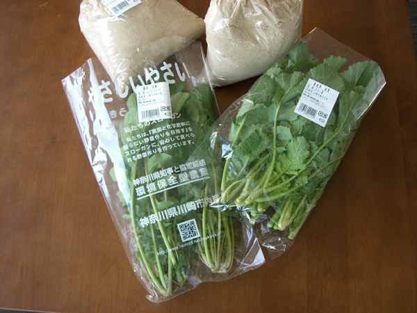ルッコラ110円 カラシ菜100円 米ヌカ20円x2 でちょうど250円!米ヌカは有機肥料作りに使います。この直場所は何でも安いのでお金を持っているとついつい余計なものも買ってしまうので、このくらいのお金を持って行くのがいいのかも(笑)葉っぱはサラダに使います。
