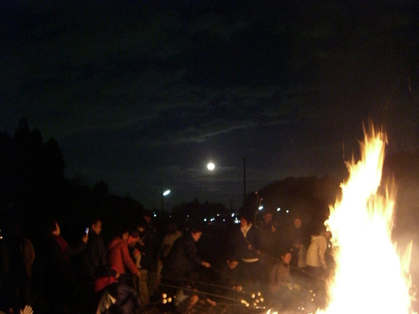 火勢が落ちて、みんなが餅を焼き始めた向こうに大きな満月が顔を出しました。