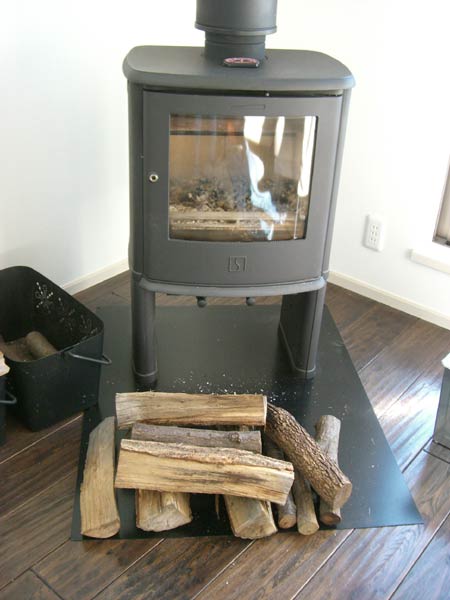 二年目の薪ストーブ。雨で濡れた薪を乾かしています。