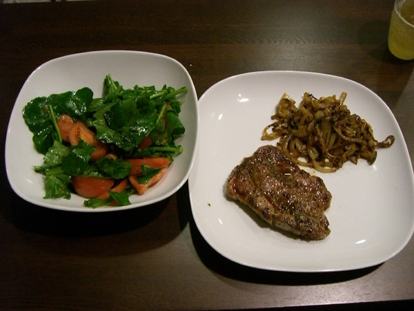 昨日の一人御飯。ルッコラとトマトのサラダにTOKYO X豚のソテー、玉ねぎが大量に余っているのでフライパンでよく炒めて付け合せにしました。