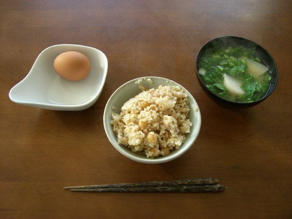 朝ごはんも一人。雑穀、豆、玄米ご飯に生卵、そしてカブの味噌汁。