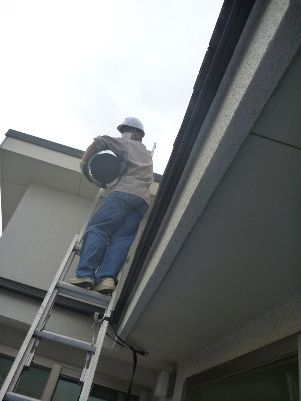 4.屋根に登って上からブラシを入れ、煤を落とす。