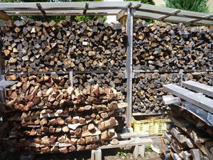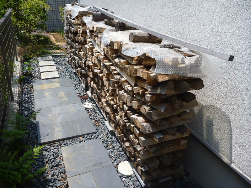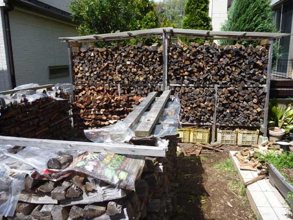 薪棚、上の段全部と下の段の向かって右側が2013年に割った薪。下の段の向かって左側のさらに右半分は2012年に割った薪(今度の冬で四年ものになります)