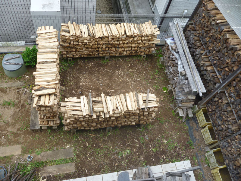 下の段の向かって左側のさらに左側とその手前に積んである薪は2015年に割ったばかりの薪