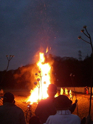 初めて見たのですが、神社に奉納された破魔弓やダルマ、お札、しめ縄などを燃やしています。この火でお餅を焼いて食べると縁起が良いらしくみなさん長い枝の先にお餅をつけて火が静まるのを待っています。