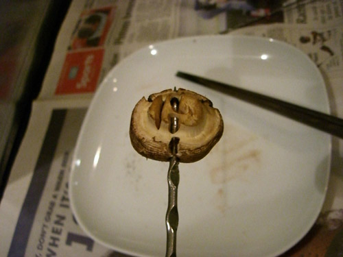 BBQの金串に一口サイズの切った具材を刺してストーブの中へー。
