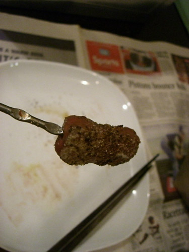 お肉。安い牛肉ですが外側は高温で一気に焼けて肉汁をとじこめて、中は遠赤効果でほかほかジューシー。直火焼きはおいしいです。