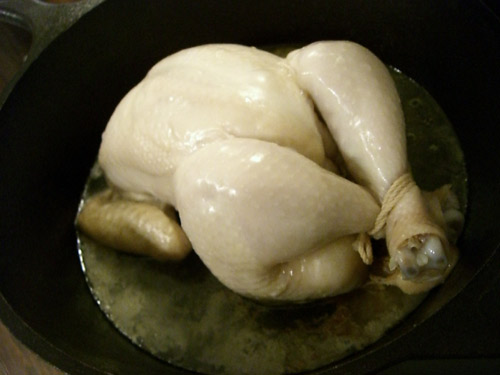 作ってみましたチキンラーメン。まずは鶏を丸ごとダッチオーブンに入れてストーブの上に放置…。