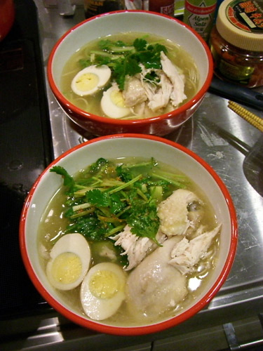 鶏ちゃんを取り出して、水で薄めて塩、酒、コショーで味を調えて麺を放り込みます。期待に胸が膨らむときです。