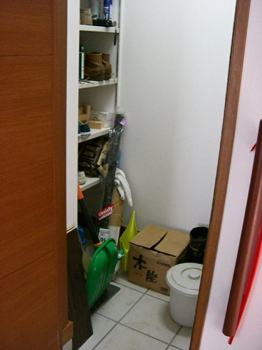 靴用ですが、クワ、シャベル、薪用の斧、ノコギリなどなんでも放り込んでおります。バケツは生ゴミ処理機で処理した生ゴミ。一杯になったら肥料として使います(処理済みなので匂いありません)ゴミをゴミの日までちょっと置いておいたり、ラディッシュぼーやのダンボールの置き場として活躍しています。1畳ちょっとのスペースですが、これのおかげで玄関は割りとすっきりしてます。