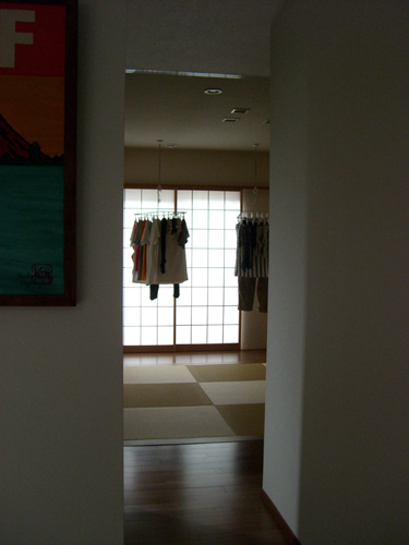 玄関から右手を見ると和室。マメに畳む方ではないのでだいたいこんな感じで洗濯物がぶら下がっています。ホスクリーン使用。