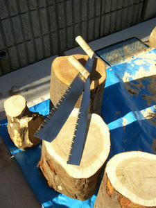 愛用のマド鋸。チェーンソウは使いません。この鋸、福島の鍛冶屋さんに作ってもらったのですが今年で2シーズン目。まったく切れ味が衰えません。硬く硬く焼き締められているようです。こういう職人の魂(今風に言えばソウル)が感じられる道具は愛着もひとしおです。ようやくうまく使いこなせてきたような気がします。堅木も面白いように切れてくれます。