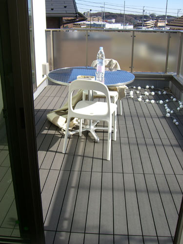 白いタイルはやっぱり汚れ易いです。庭仕事をするときには履き替える靴を持って行きます。そのまま入ってくると大変です。日常のお掃除はホウキでゴミを取って、デッキブラシでゴシゴシやると乾いた泥なんかは落ちてくれます(真っ白に、という訳には行きませんが…)本格的にやるときには水をジャーって流しちゃいます。洗剤付ければかなりキレイになりますが冬場は乾かすのが寒いのであんまりやりたく無いです。