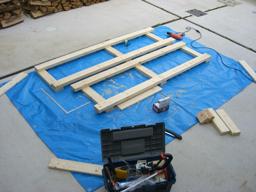 そして今日は仕事前の時間を使って薪を載せる棚作りです。あらかじめ買っておいた2x4材をサイズに切って、日の字に組んだ枠を二つ作りました。