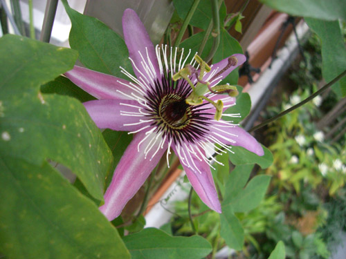 東側のフェンスに這わせている時計草の花が咲きました。朝開いて夕方には閉じてしまう一日だけの花です。
