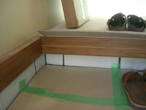 長い木材をいろいろな場所に置いて、問題が出そうなところがないか確認しましたが、それほど神経質にならなくても大丈夫そうな感じです。貼り方向は床とは違う方向になってしまいますが、長手方向に合わせて貼ろうかと思っています。その方が直線が長く出てすっきり見えそうです。