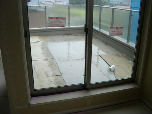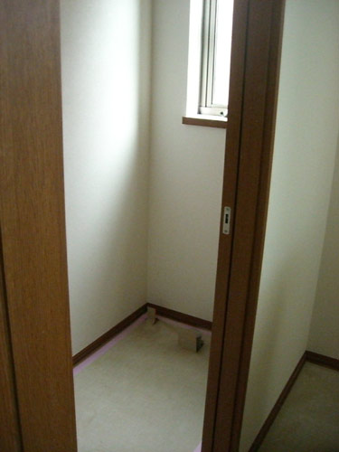 修整作業には関係ないところのクロスが貼られていました。これは洗面室。風呂の窓デカイなあー。南側の家から丸見え。見えすぎだったらブラインドでも付けようか。これは住み始めてから考えることにします。風呂の外の軒下に一応吊り元付けてもらってます。