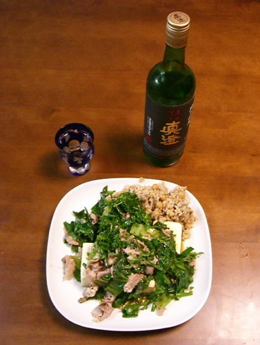 海で思い切り身体を動かした後は、晩ご飯です。心地よい疲れと日に焼けた肌、部屋を抜ける夕方の風がいい気分です。KURIさん一人のときはこんな一皿料理が多いです。トウフの上にレタスとニラ、豚肉を塩ポンズで和えたものをぶっかけた特製冷奴。酒は酒好きならきっと知ってる長野の真澄。食べ終わっても簡単後片付けです。美味しかったあ~。OUR HOUSEのテラスで食べたら最高だろうなあ~。