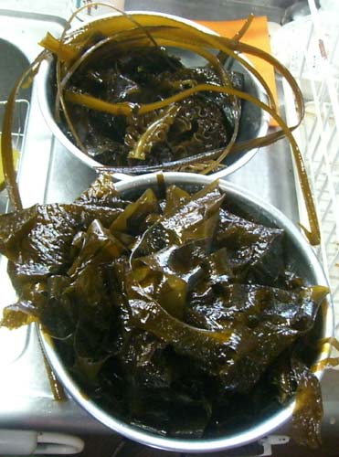 鎌倉のワカメです。獲れたてはスーパーで売っているものと味が違います。メカブと茎ワカメと葉っぱに切り分けているところです。葉っぱは茹でて干して、今年の分の干しワカメ。メカブは叩いてご飯に乗せて食べるともう最高!