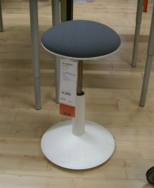 不思議な形に不思議な座り心地。底の平らな部分が少ししかなくて、斜めにして座れます。よく前か後ろの足だけで椅子を斜めにして、わざと不安定に座っている人っていますが、あんな感じ(こんな説明で判ります?)なんだか面白いイスです。