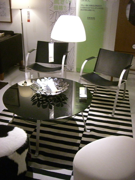 一方TAMAさんは椅子がいいみたいです。このスチールとレザーのこれがいいみたい。手前の牛さん柄のスツールもお気に入りです。このテーブルとセットがいまのところ第一希望。