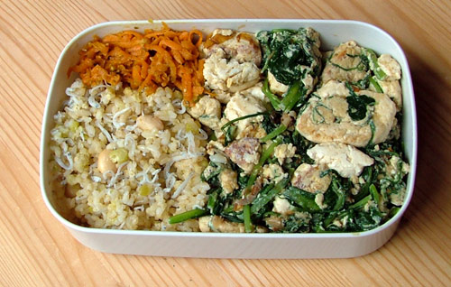 今日のメニューは、おかひじきとほうれんそうとトウフとタマゴのチャンプル。人参のサラダに玄米と豆(大豆、緑豆、アマランサス、キビなど)とチリメンのご飯。KURIさん作です。