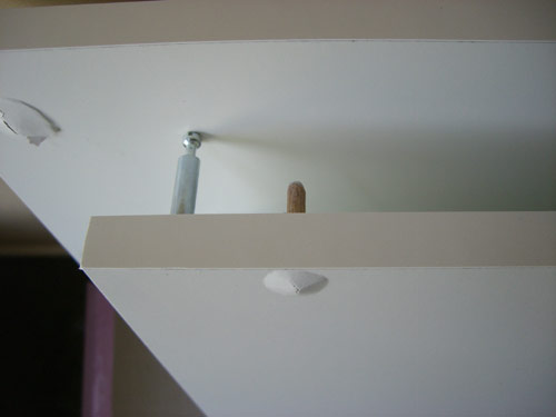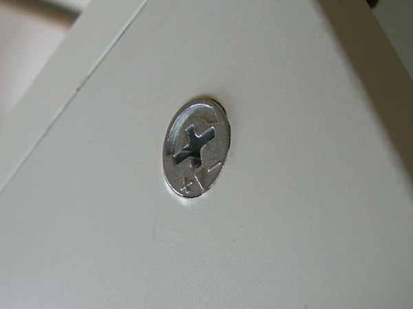 2007年6月29日追記:このボビンネジ(勝手にそう呼んでます)が浮き上がってくる現象ですが、これからもたくさん組み立てなければいけないので、IKEAさんといろいろお話をしたところ、ボビンネジを受ける方のネジを締め付けすぎるとこうなってしまうようです。木工なのでそんなに力一杯締めた覚えはないのですが、これから組み立てに挑戦される方(私も含めて)注意してください。