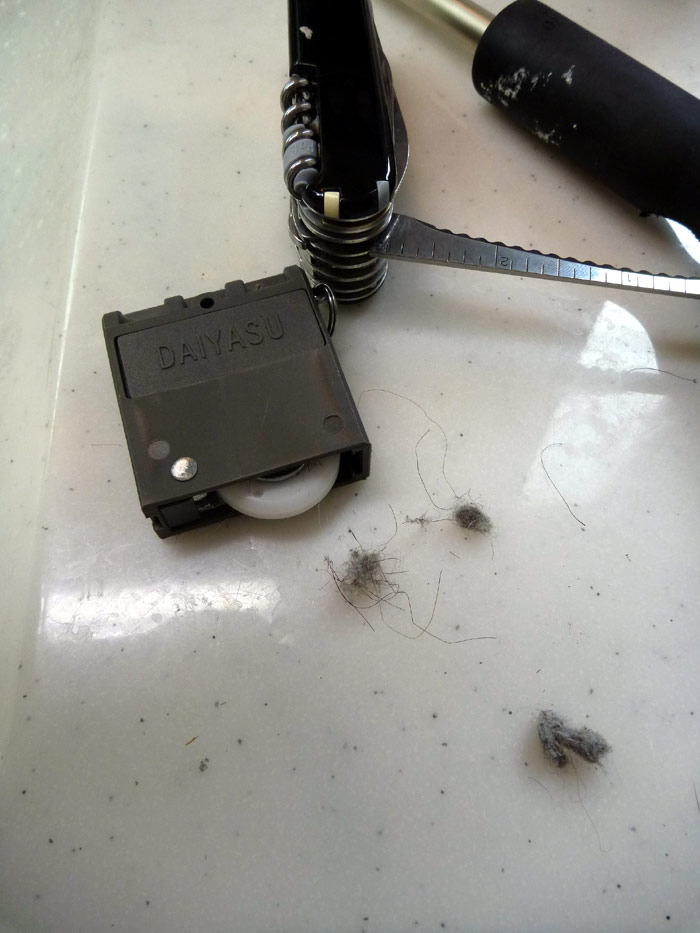 戸車は密閉式になっていて掃除しにくいのですが、金属の細い棒でつついたりカッターの刃で滑車の軸の回りに絡んだ髪の毛を切って取り出します。それでもなんとなく何かが絡んでいるようで気持ちよく回ってはくれませんが、滑車が外れない限りそれ以上は無理なのでCRCを吹き付けて元のように取り付けます。