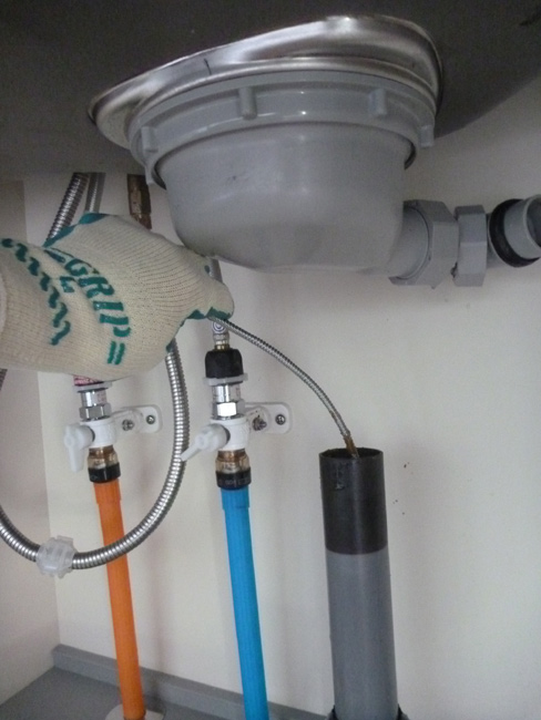 シンクからはブラシは入りません。シンク下の引き出しを抜いて、U字のパイプを外します。(外す前にU字の下の部分から水を抜くのを忘れずに)
