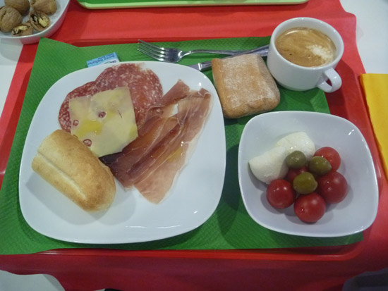 朝ごはんはビュッフェ。イタリアの朝ごはんはシンプルなコンチネンタルスタイルかと思っていたら違うんですね。それとも昔とは変わったのかしらん?